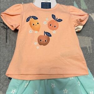Adorable Pekkle baby dress set. Features a mint dress with a cute peach design and floral accents. Includes a peach and white polka dot shirt.