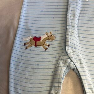 Charming blue striped baby onesie by Pekkle. Features a brown trim for added style.