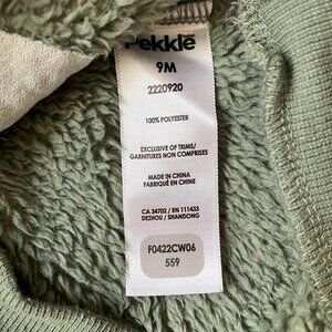 Pekkle 9M sweatshirt, Baby dinosaur pullover, Green fuzzy baby fleece, Stegosaurus baby top, Soft baby loungewear, Pre-loved baby clothes, Baby fall/winter fleece, Cozy baby pullover, Dino baby clothes, Pekkle baby top 9 mois, Cute baby sweater, Gender-neutral baby outfit, Baby layering sweatshirt, Warm baby fleece 9M