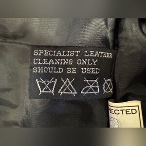 Men’s 100% Leather Jacket spread collar front zipper closure stretchy bottom hem and sleeve cuffs 2 side pockets 2 bowling pins and bowling ball on the backside of the jacket lined shoulder pads