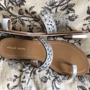 Pelle Moda Toe Loop & Embellished Strap Slip On Leather Sandal Silver Sz 9 NWOT