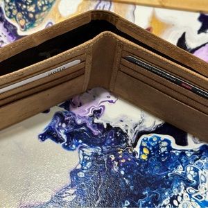 8 card slots with a cash buy food section and several other small areas to put important receipts. Wallet is nicely thin and won’t add book to a pocket or bag.