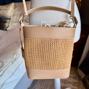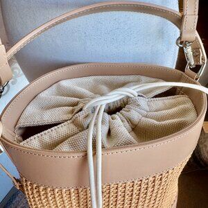 Pelletterria Veneta light tan leather and raffia small bucket bag with convertible/adjustable crossbody strap. Has drawstring tie canvas top, silver hardware. In great used condition, a few small marks on base as shown in photo 13. Measures 6.5 inches long, 5.5 inches wide, 8 inches tall. Bucket strap drop is 4 inches, crossbody strap drop adjusts from 22 inches to 24.5 inches. Cat friendly, nonsmoking home.