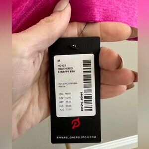 Keywords: Peloton sports bra, Peloton activewear, pink sports bra, strappy back sports bra, heathered sports bra, women’s medium sports bra, yoga top, workout bra, gym sports bra, spin class outfit, athleisure bra, racerback style, low impact bra, fitness clothing.