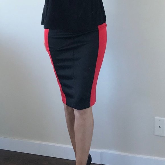 Pencil skirt with black thick zipper in the back. the sides have red detail. the top is fitted around the chest and flares out.