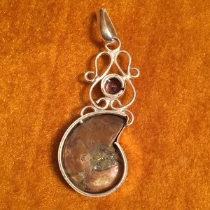 This is a new silver pendant stamped 925, with a fossil and semi precious amethyst. Measures 2.5” in total.