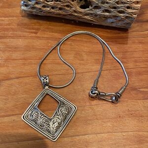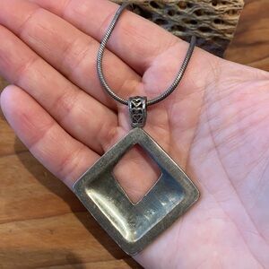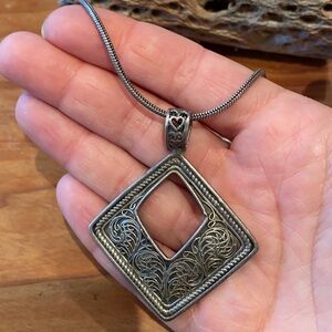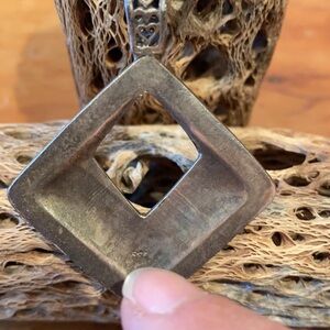 I bought these in India once upon my travels and have worn them a fair amount, always getting compliments. Beautiful patterns on this pendant and very cool clasp design on the necklace. FYI to a potential buyer that the back of the pendant is “stamped” but ineligible so I can’t confirm metal (see pic 5). Also need buyer to note that there is a hairline crack (see pic 11) on the clasp system. It’s designed like a screw so that you can undo it and switch pendants if you’d like. I wore it as is but you may want to consider putting a tiny piece of clear tape or even paying to have that welded if you prefer to keep it secure and to stop it from worsening as you wear it. This listing is essentially for the pendant and I am including the necklace for free because it originally came with it. Feel free to message if you have any questions before purchase. Bundle with 2+ items and I will send a discount offer to consider.