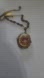 The pendant hangs from a long chain that has sections of textured or decorative links, interspersed with smoother sections. There are also what look like small pearl-like beads near where the pendant attaches to the chain, along with a heart-shaped detail. The metal appears to be an antique gold-tone or brass tone.