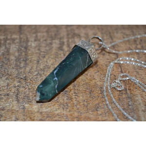 Pendant Wand Green Serpentine or Moss Agate Sterling Silver Box Chain 925 KAY