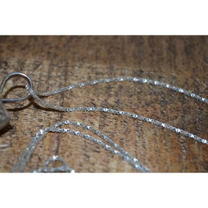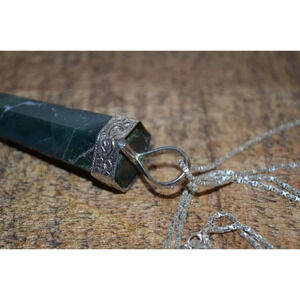 Stunning wand pendant in a green stone - it may be serpentine, moss agate or something else - I really don't know. Rich green color with white veining. Wand is 2" long, or 2.5" with the loop. Box chain is stamped 925 KAY so I assume it's from Kay Jewelers. It's 29" long and weighs about 6 grams. I do not know if the pendant's setting is sterling or not. I suspect this is not the chain it originally came with. Lovely condition.