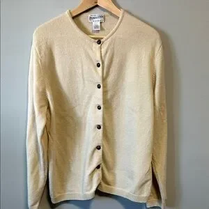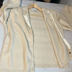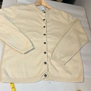 Elegant cream cardigan with button-up front. Soft and stylish. Perfect for layering.