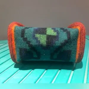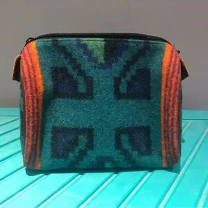 Stylish wool bag by Pendleton. Features a geometric pattern with blue and orange hues.