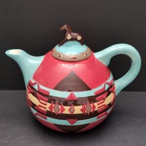 Pendleton Home Collection,blue/red ranch house tea pot with a horse on top of the lid,Native American inspired.