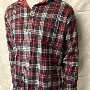 Classic plaid design. Button-up front. Long sleeves. Comfortable fit. Vintage.