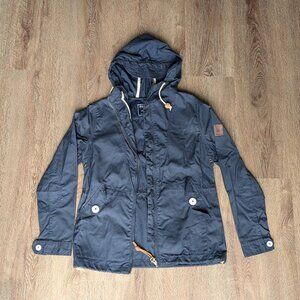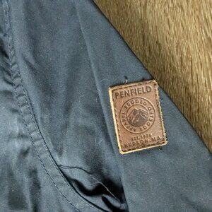 High-quality, buy -it-for-life Penfield waxed cloth rain jacket / coat in navy blue with white buttons. The coat is in excellent condition--like new, worn only a couple of times. It has 2 deep side pockets, waist and hem leather pull strings, and a beaked hood with cork drawstrings. Weatherproof Hudson waxed cloth 65 /30 poly cotton, 190gsm weight.