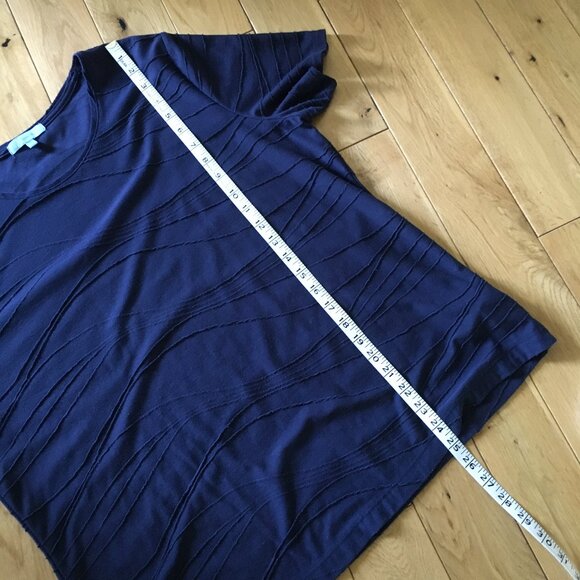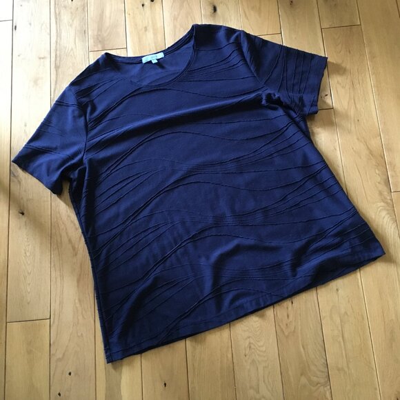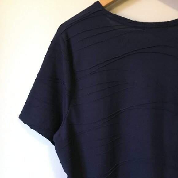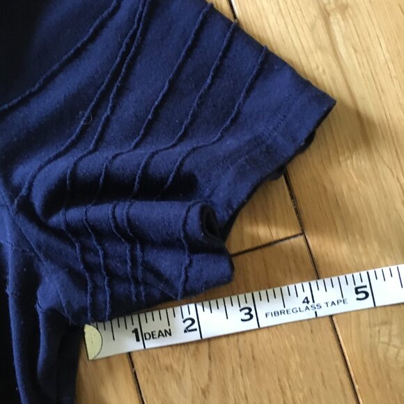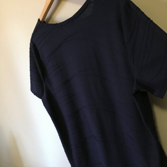 Very good preowned condition, dark navy blue tee by Penmans featuring a raised pattern of wavy lines throughout. Really quite cool and unique. Never seen another shirt like it. Easiest to see the texture in the close up measurement photos.