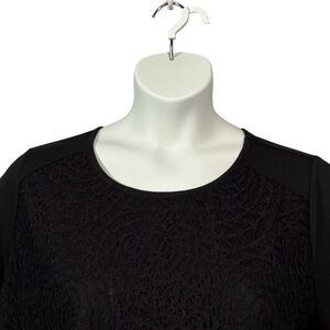 Elegant black top with swirl-pattern lace overlay on the front and solid back and sleeves. Made from a soft, bi-material blend with stretch. Features 3/4 sleeves and a round neckline.