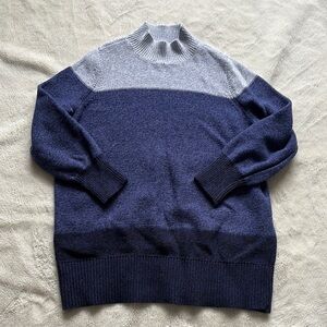 Stay warm and stylish with this chunky knit colorblock sweater in beautiful shades of navy, denim blue. This cozy pullover features a high mock neck, long sleeves with ribbed cuffs, and a wide ribbed hem for a flattering, slightly oversized fit. Perfect for layering over leggings or jeans for a relaxed, effortlessly chic cold-weather look.