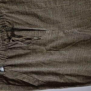 Elegant womens dress pants with a subtle black and light brown pattern. Features a comfortable fit and drawstring waist.