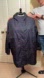 Stylish navy blue rain coat with hood. Features subtle pattern. Perfect for cool wet weather. Snap and zipper closure. Zipper pockets. Pre loved condition. No flaws.
