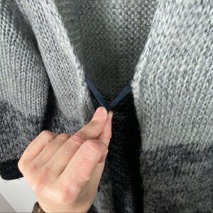 Penningtons PS Career Long Wool Blend Duster Cardigan in Black and Grey. Women's size 0X (but fits most). Had tie closure but can also be worn as a long open front sweater cardigan. 15% wool and 85% acrylic. Collared. Colour block style. Very good pre-loved condition. No visible flaws.