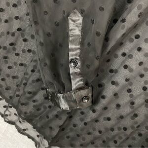 Penningtons Babydoll Blouse / Top. Women's tag size 1X (plus size). 100% polyester. Black sheer mesh with black velour polkadots. Long sleeve. Henley neckline with ribbon. Wide ribbon single button cuff with button wrist tab. Very lightweight and flowy.