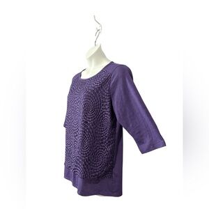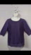 Beautiful deep purple top with a swirl lace overlay on the front and solid back and sleeves. Lightweight, soft bi-material blend with stretch. Features 3/4 sleeves and a rounded neckline.