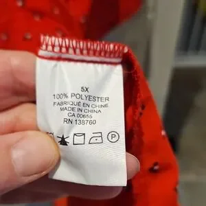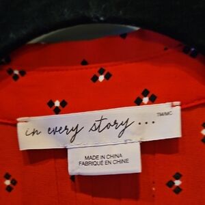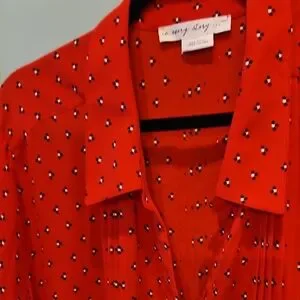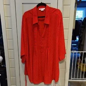Vibrant red tunic with a stylish pattern. Features a relaxed fit and button details.