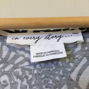 Very good preowned condition, stretchy, short sleeve, V-neck tee by Penningtons featuring a black and white tropical leaf silhouette print and a cute tie up feature at the collar. Can be worn tied or untied.