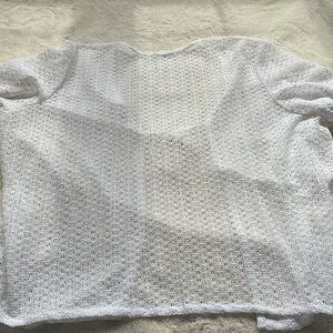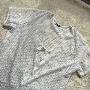 Penningtons women’s white open-knit short sleeve cardigan bathing suit cover up featuring a lightweight, breathable fabric perfect for layering. Designed with a subtle texture and front tie closure, this piece adds an airy, feminine touch to any outfit. Ideal for spring and summer styling—wear over tanks, dresses, or camis for effortless layering.