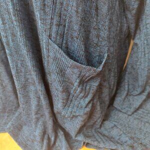 This previously owned top is in good used condition and features long sleeves, v neck, and two front pockets near hem. The top is ribbed and is a navy blue with black peppered throughout. A top that looks great with tights and a perfect fall staple!