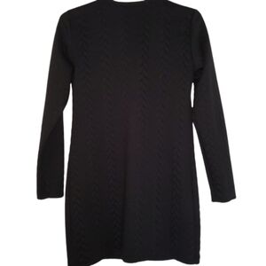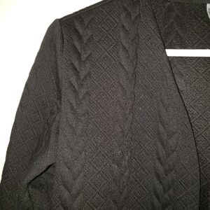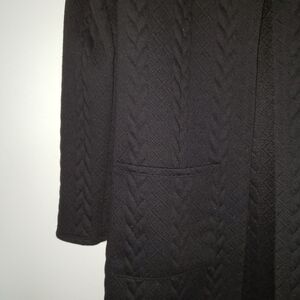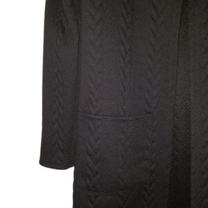 Pentagone long black texture patern cardigan, no buttons, 2 pickets front. In nice condition size small 88% polyester 9% viscose 3% soandex