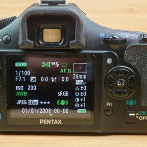 Pentax K200D DSLR with 10.2MP APS-C CCD sensor. Includes 18-55mm f/3.5-5.6 AL II lens.