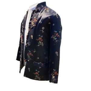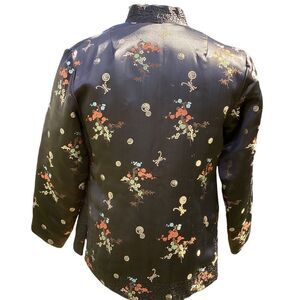 Medium but fits small. Lined, mandarin collar, long sleeve, side slit pockets, 4 button corded embroidery closure, quilted detail, made in Shanghai. EUC, neck to hem 25”, armpit to armpit 18”, armpit to cuff 16”.