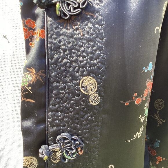 Medium but fits small. Lined, mandarin collar, long sleeve, side slit pockets, 4 button corded embroidery closure, quilted detail, made in Shanghai. EUC, neck to hem 25”, armpit to armpit 18”, armpit to cuff 16”.