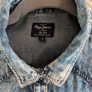 Get your acid wash groove on with this Pepe Jeans London 100% cotton denim shirt! This piece brings a touch of vintage Western-inspired vibes to your modern wardrobe. Featuring cool pearl button snaps, this shirt is perfect for a bold statement or as a versatile layering piece. Rock it with your favorite jeans for a double denim look or throw it over a tee for instant cool. Warning: May cause spontaneous flashbacks to big hair and mixtapes.