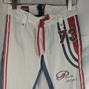 Pepe Jeans London Women's 25 White Red Blue Embroidered Side Stripes Denim Pants