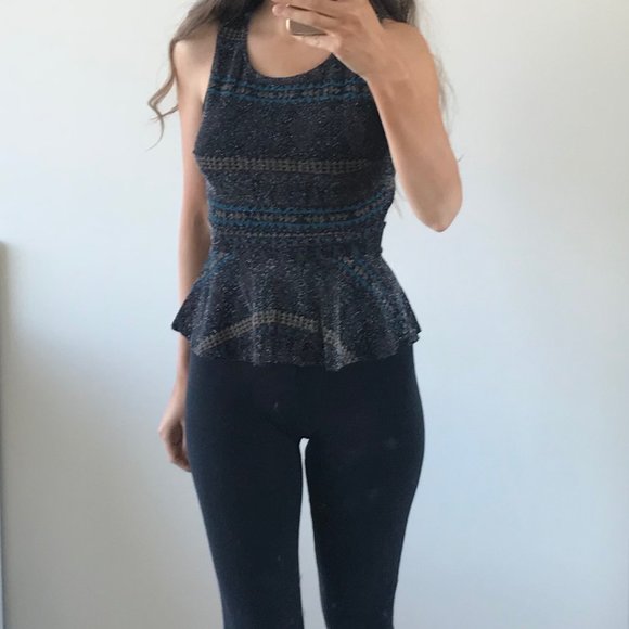 Peplum open back top with silver lurex Size Small Black print Excellent condition