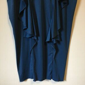 Very good preowned condition, dark navy blue, sleeveless blouse with ruffles going down either side of the body and stopping at the waist by Pepper Plus. Slinky and shiny as a seal. Chic. I think this might be a branch of Blu Peppercorn, as it looks similar to the logo. Not sure though.
