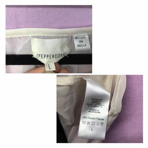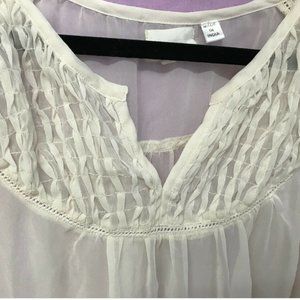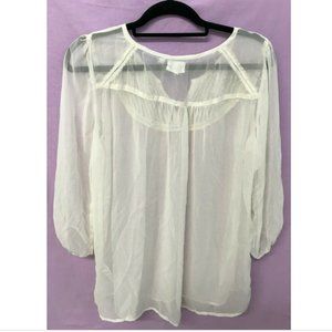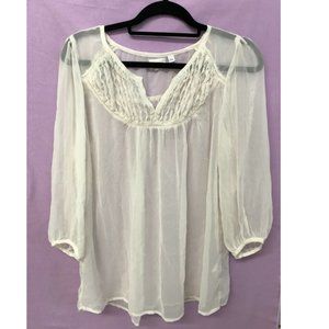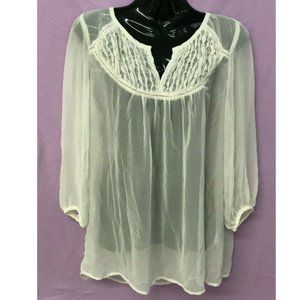 Peppercorn sheer ivory blouse with delicate smocking detail at front neckline and eyelet detail at front & back of shoulders. Long sleeves are gently gathered at hem. Label size is Large, top has a loose/flowy style, see below for garment measurements. Very good pre-owned condition.