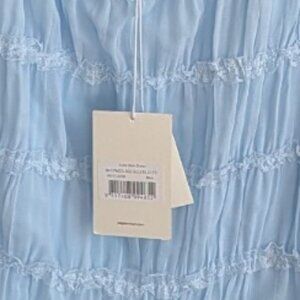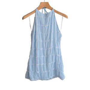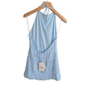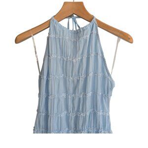 The Aullie Mini Dress by Peppermayo features a halter neckline with a tie at the neck, creating a customizable fit. Its open back adds a sultry touch, making it the perfect piece for a night out. Made from a ruched baby blue chiffon fabric with lace trim detail.