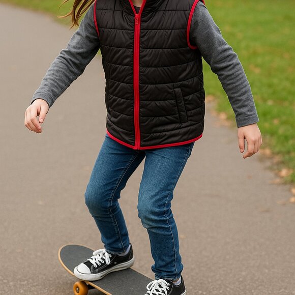 Black sleeveless quilted puffer jacket with red trim and zipper, red lining and front slash pockets