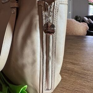 Features: Polished silver-tone hardware, two exterior zippered side pockets, classic Coach plaque but no hangtag/charm.