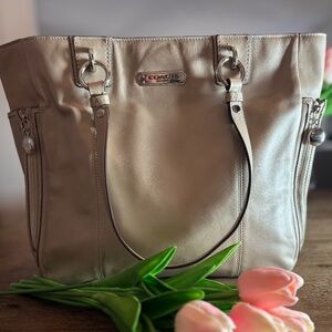 This is an incredibly beautiful, authentic Coach tote bag in a stunning shiny light gold/beige leather. It’s in PERFECT, like-new condition!