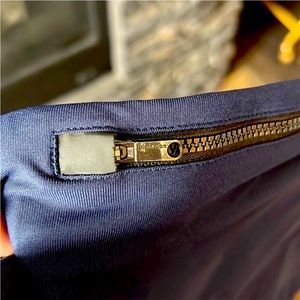 This excellent condition. Lululemon jacket is navy blue with gray detailing. It has a varsity look, but it’s still a performance jacket.