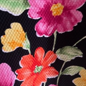 Sweet Kenar Dress that is a perfect cocktail dress for a wedding or backyard soirée. Gorgeous textured fabric with bright floral print.