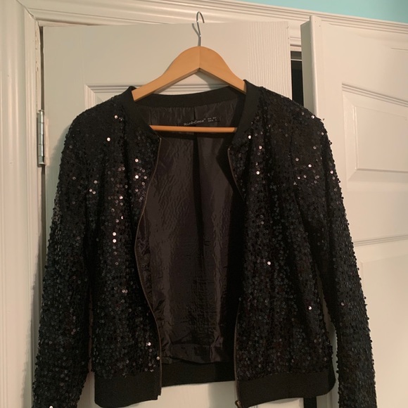 Perfect condition. Worn twice. Purchased for $50usd plus shipping and duties. Light weight, glitter bomber jacket. Very flattering.