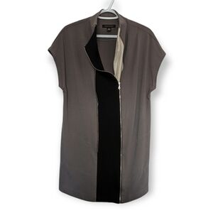 Very good pre-owned condition with cap sleeves, full zip front, decorative zipper detailing, and front pockets. Minor signs of fabric wear.