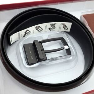 This Perry Ellis black-buckled reversible cap leather belt is a sleek addition to any man’s attire. With a reversible belt buckle, you can change your favorite belt from black to a deep brown by simply rotating the buckle. We finished it with a metallic black belt loop, rounded tip and a single-prong closure.