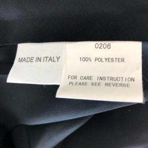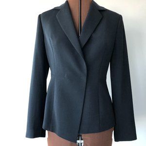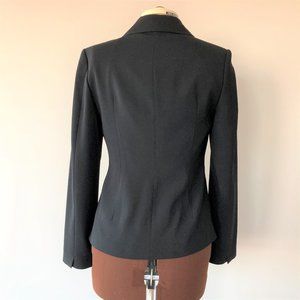 Made in Italy basic black blazer lined with asymmetrical front hem, front snap closure with stitching detail instead of buttons and buttonholes. Jacket has side vents and sleeves also has vents. Condition is preowned in excellent shape with no visible flaws. Hangs beautifully. Great basic piece with a minimalist vibe.